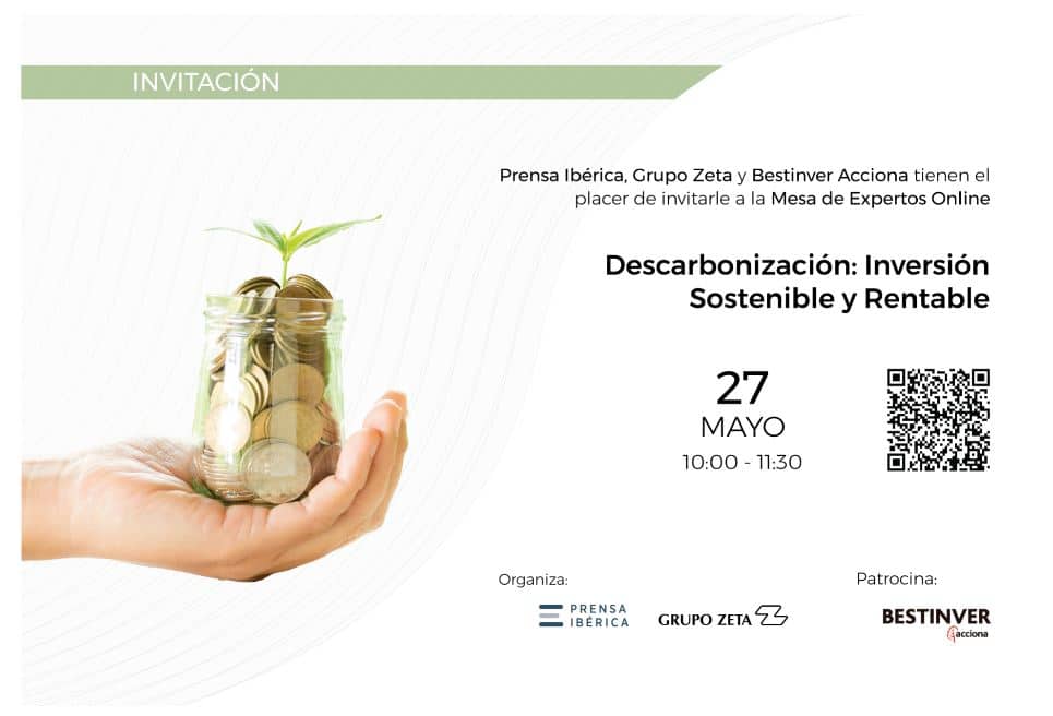 Prensa Ibérica, grupo al que pertenece Diario de Ibiza, Grupo Zeta y Bestinver, del grupo Acciona organizan el 27 de mayo, a las 10 horas, la mesa de expertos online ‘Descarbonización: Inversión Sostenible y Rentable’. El acceso es gratuito, solo es necesario inscribirse en este enlace