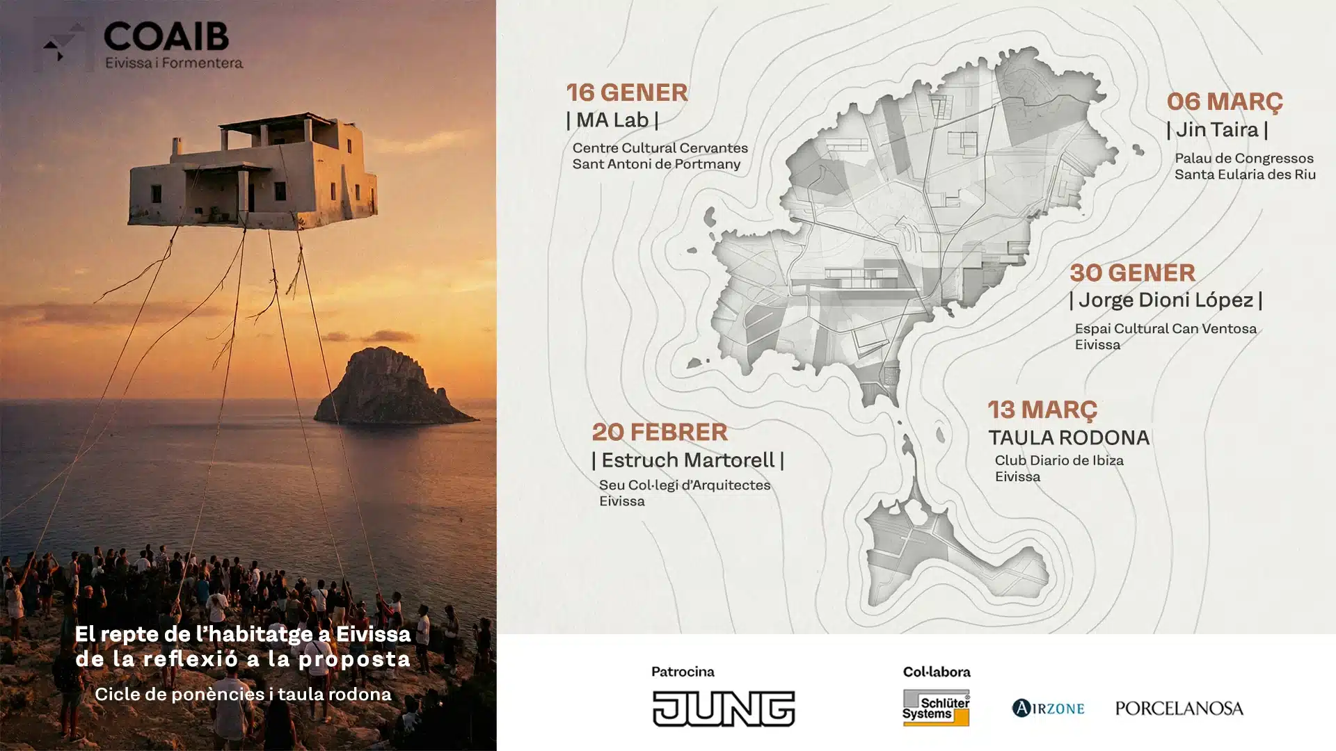 Con el título ‘El repte de l’habitatge a Eivissa: de la reflexió a la proposta’, el Colegio organiza una mesa redonda en la que participarán Mariano Juan, conseller de Territori del Consell de Insular de Ibiza; Alfonso Rojo, presidente de la Pimeef; Juan Torres, director de Cáritas Ibiza; Clara Muñoz, directora de la Fundació Salas; Marina Moheno, coordinadora técnica de la Aliança per l’Aigua; y Lluís Oliva, presidente de la Demarcació d’Eivissa i Formentera del Coaib. El debate estará moderado por Cristina Martín, directora de Diario de Ibiza.