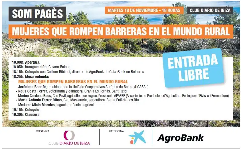 Som Pagès. Mujeres que rompen barreras en el mundo rural es el título de la jornada que se celebrará el martes 18 de noviembre a las 18 horas en el Club Diario de Ibiza. La jornada, está organizada por el Club Diario de Ibiza y cuenta con el patrocinio de AgroBank (CaixaBank).